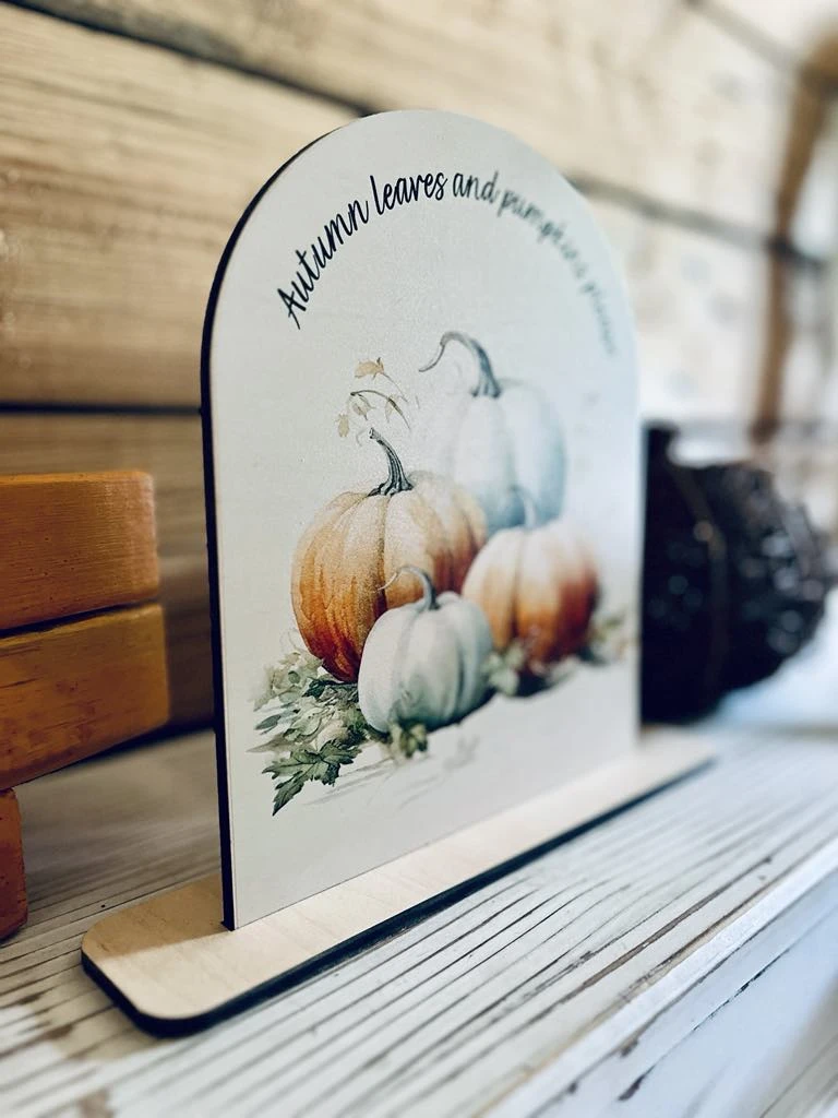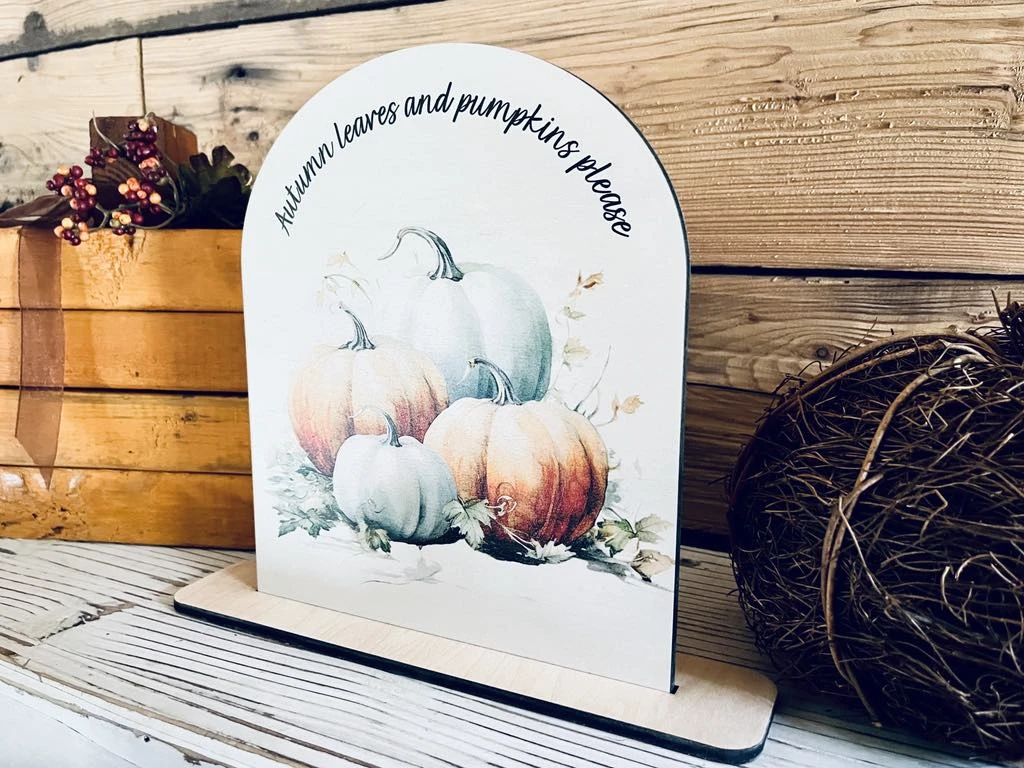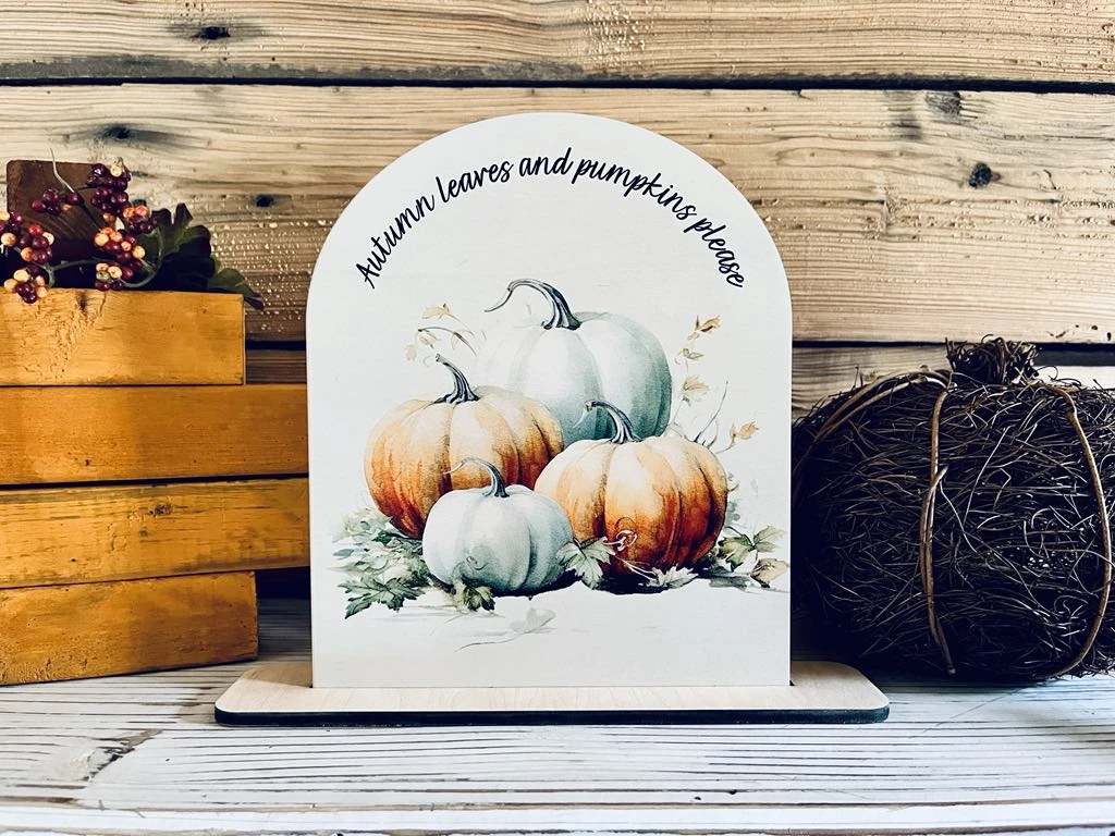 Add a cozy fall touch to your home with this charming arch-shaped shelf sitter featuring soft watercolor pumpkins and the phrase “Autumn leaves and pumpkins please” printed in a graceful curve.