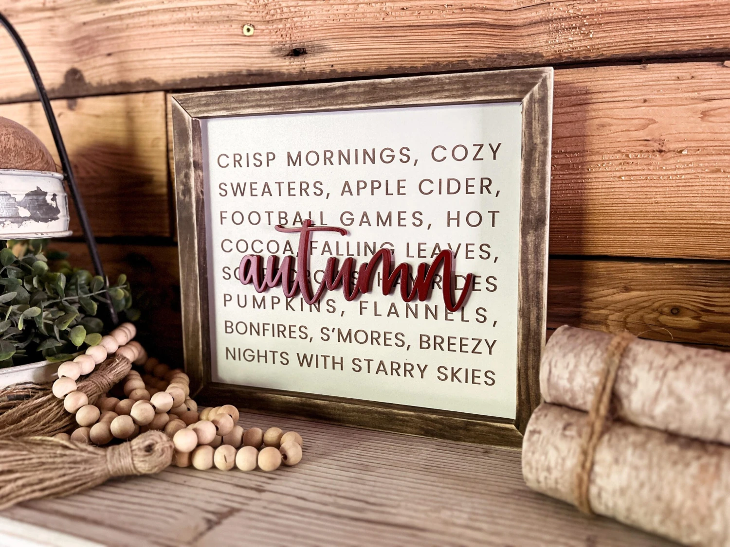 Complete your fall decor with this beautiful framed wood sign featuring everything we love about autumn!
