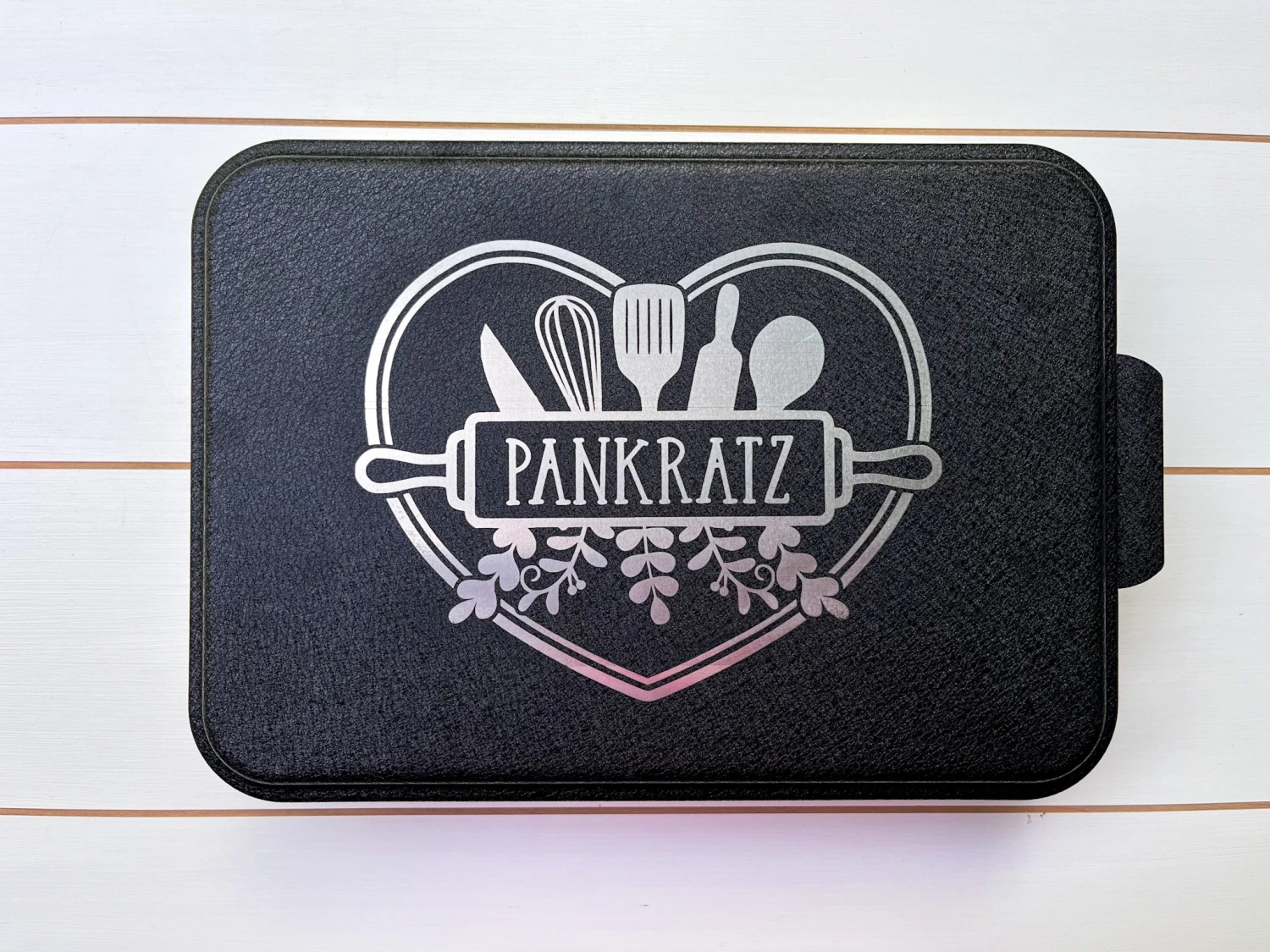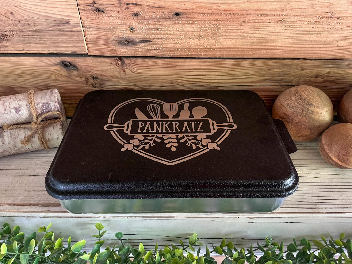 9 x 13 Aluminum Cake Pans are something almost anyone can use. These sturdy pans have a powder coated lid that snaps on easily and securely! Add a monogram or name to personalize for a house warming, wedding, or bridal shower! Customize with a logo or other graphics to create the perfect award for a bake off! The possibilities are endless!