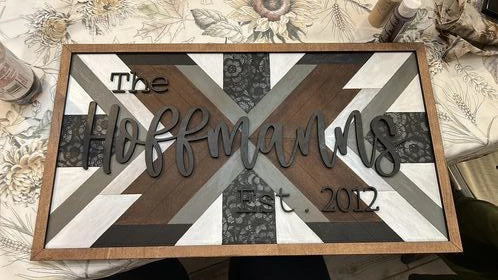 - Wood cutout of background board that has outlines scored of where letters and design will be placed