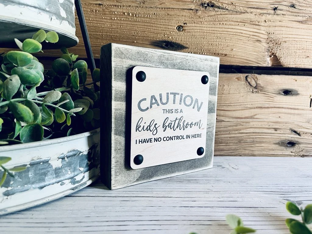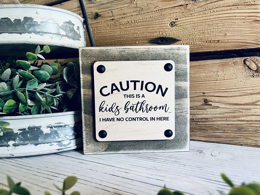 Add humor and farmhouse charm to your space with this funny kids bathroom sign! Designed for parents who know the chaos of a kid-filled bathroom, this rustic wood sign reads: