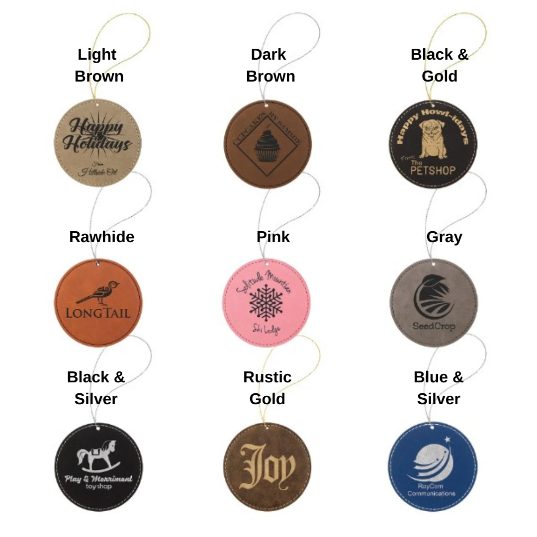 - Ornament is made from laserable leatherette which offers the look and feel of genuine leather at a fraction of the price. This richly textured, synthetic material resists water spots, cleans easily, and is durable enough for the rigors of daily use. The high quality workmanship of each leatherette piece is sure to impress you with its elegant individuality.