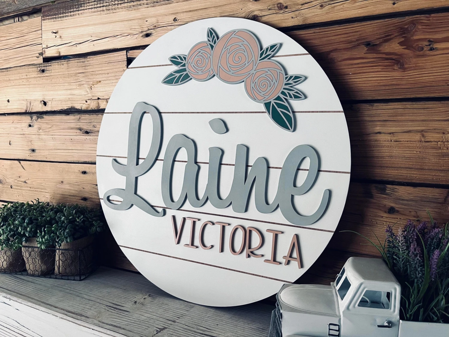 A simply stunning and adorable shiplap circle sign with laser cut letters, perfect for a nursery or child’s bedroom.