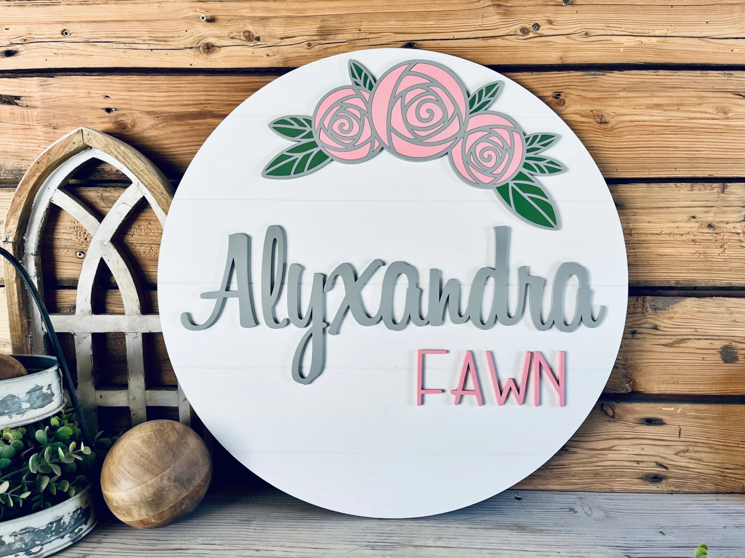 - Background and letters painted in any color of your choosing (This pictured sample has a background in Linen White, ‘Laine’ is in Aged Gray and ‘Victoria’ is in Blush Pink.)