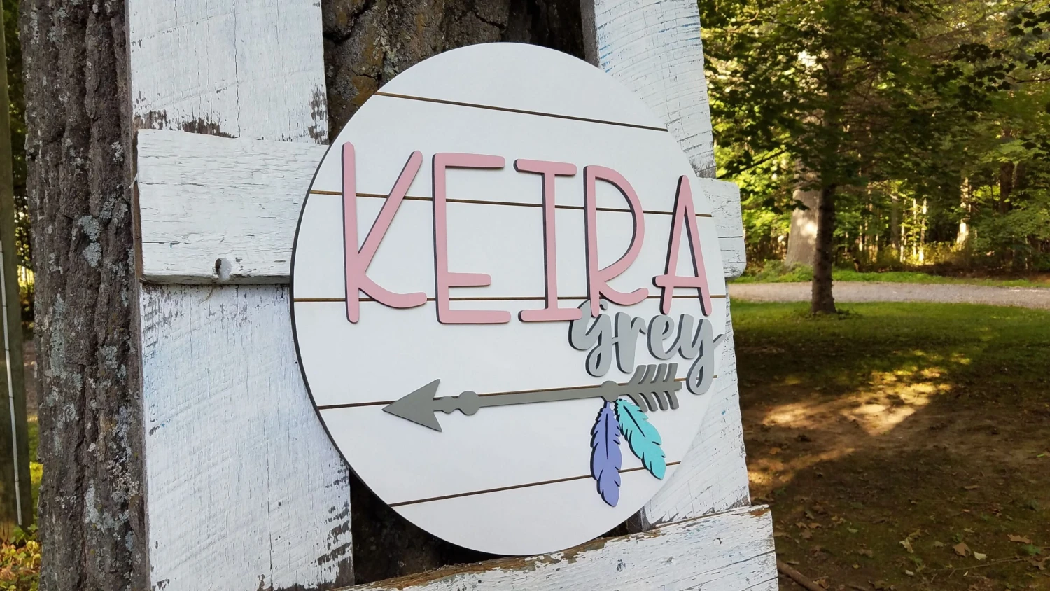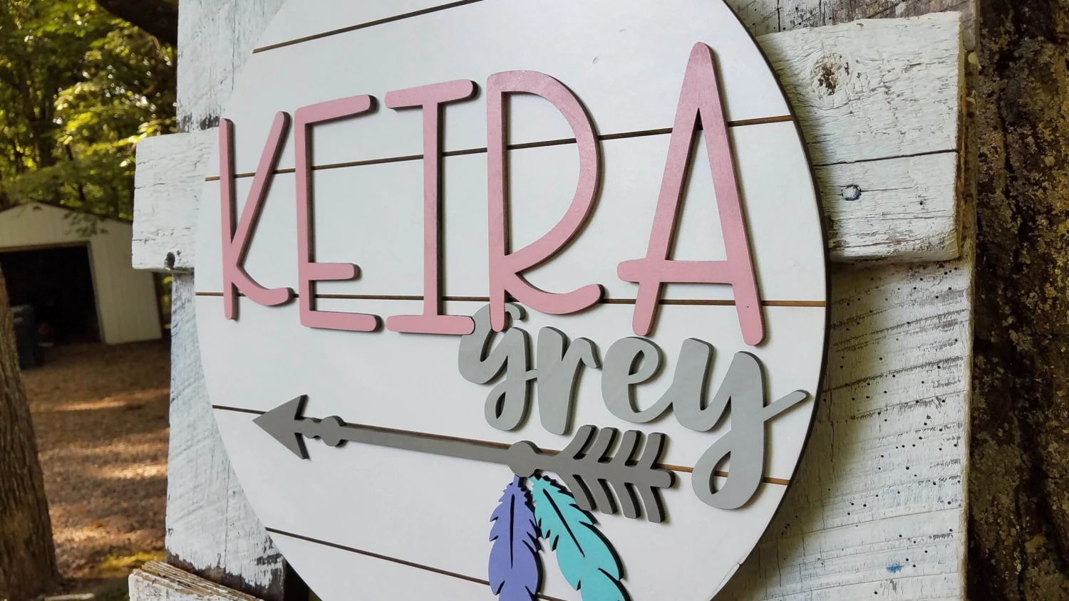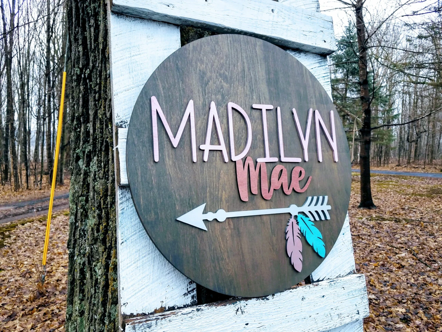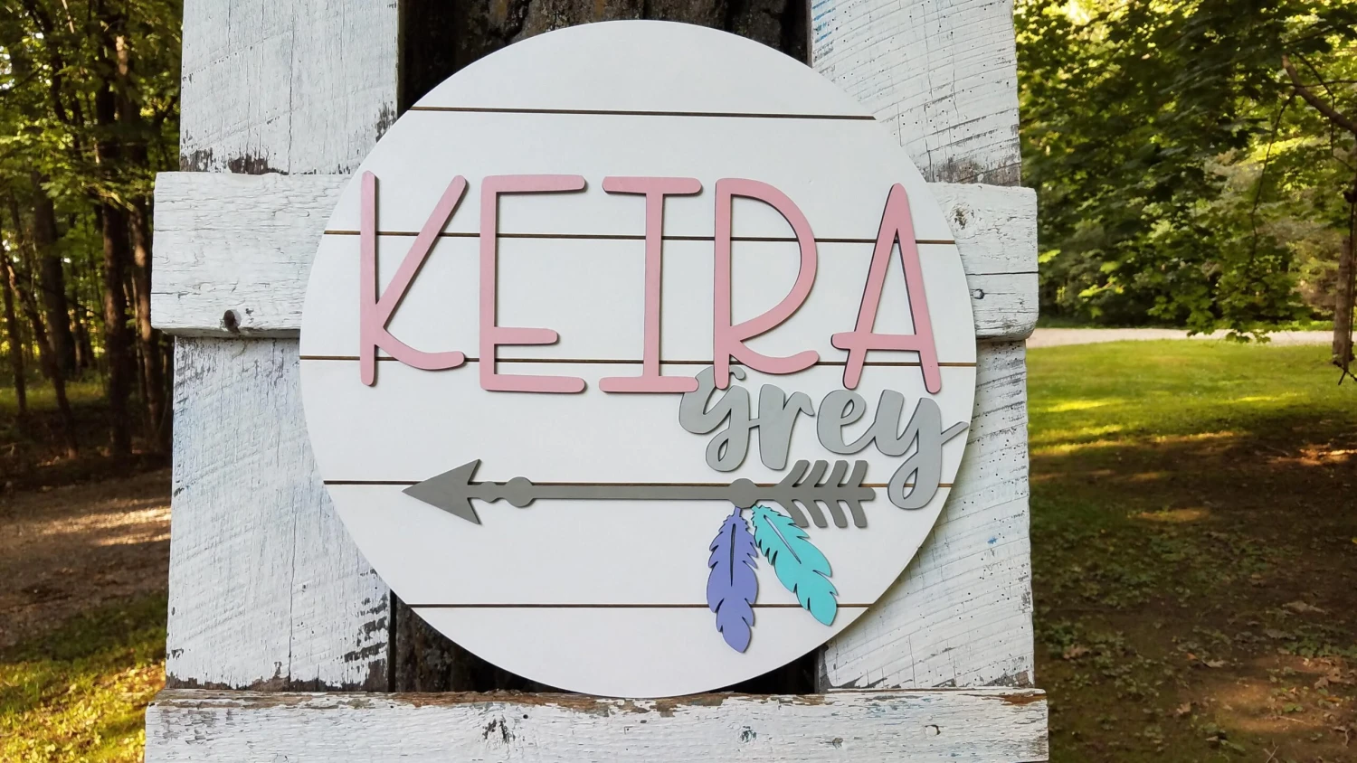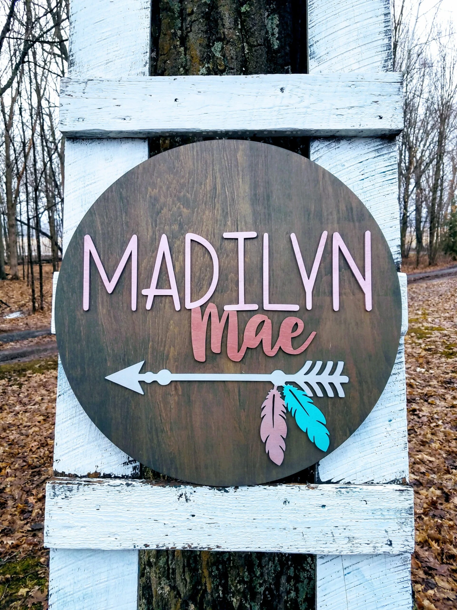 Your little girl or boy will love this round circle sign in their room, highlighting their first and middle name. Pick their favorite colors for background, first name and middle name to perfectly pair this sign with your decor.