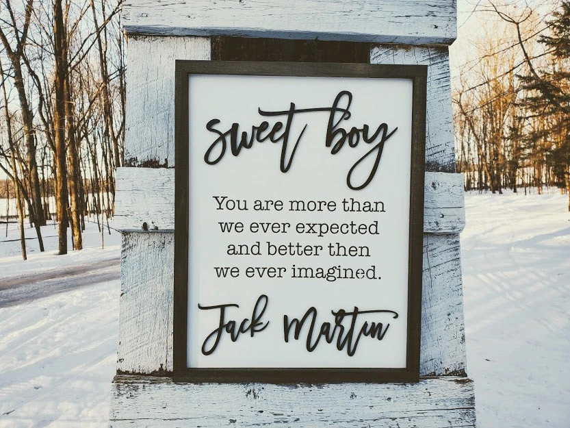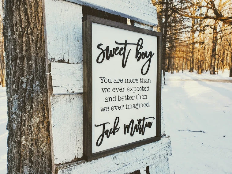 - “Sweet boy” and “Jack Martin” letters are laser cut, painted and glued onto the birch background board.