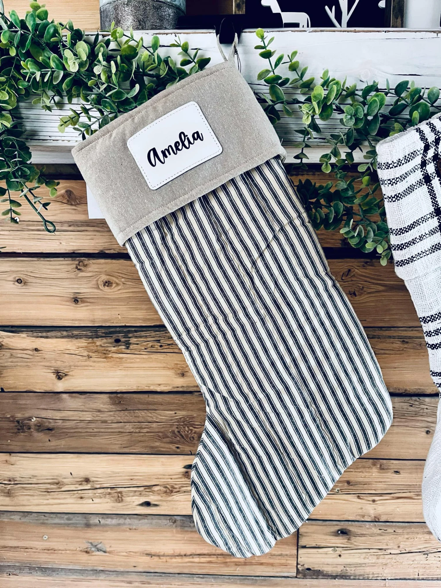 Craft the perfect vintage farmhouse Christmas look with this simple yet elegant stocking. The Sawyer Mill Charcoal Ticking Stripe Stocking features a charcoal and tan ticking stripe base for a simple retro look. A coordinating cuff in light tan includes two pewter bells and a simple hanging loop. Coordinates with the Sawyer Mill Charcoal Collection by VHC for vintage farmhouse style for the whole home. Includes: 1 x Stocking; Care Instructions: Spot Clean Material: 100% Cotton Shell, Polyester Batting, Polyester Taffeta Lining