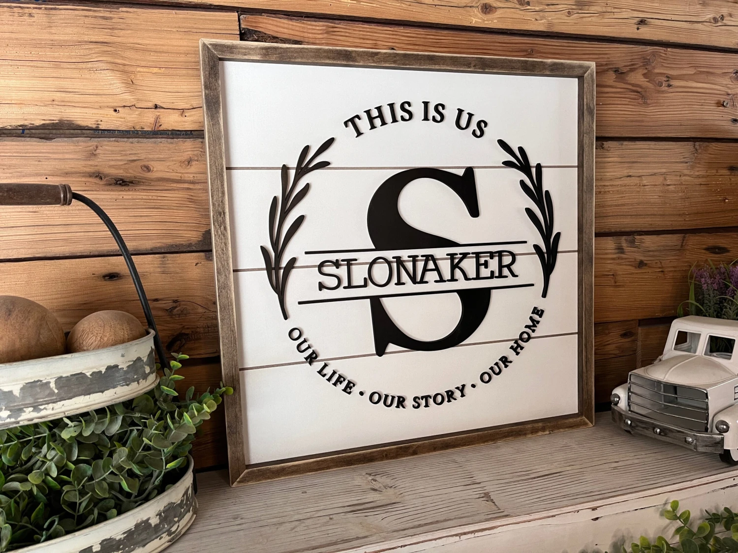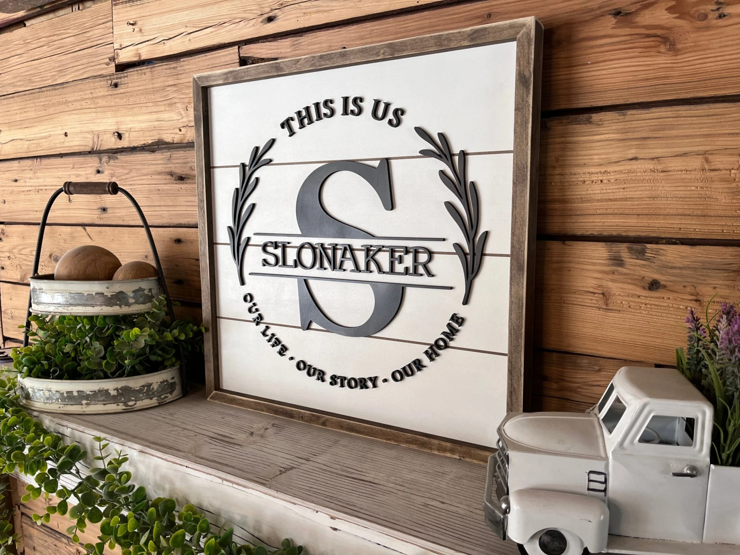 An elegant addition to any room in your home and customized to fit your every wish. The 3D cut-out names overlapping the shiplap background creates a stunning and eye-catching visual that is truly unique to your family.