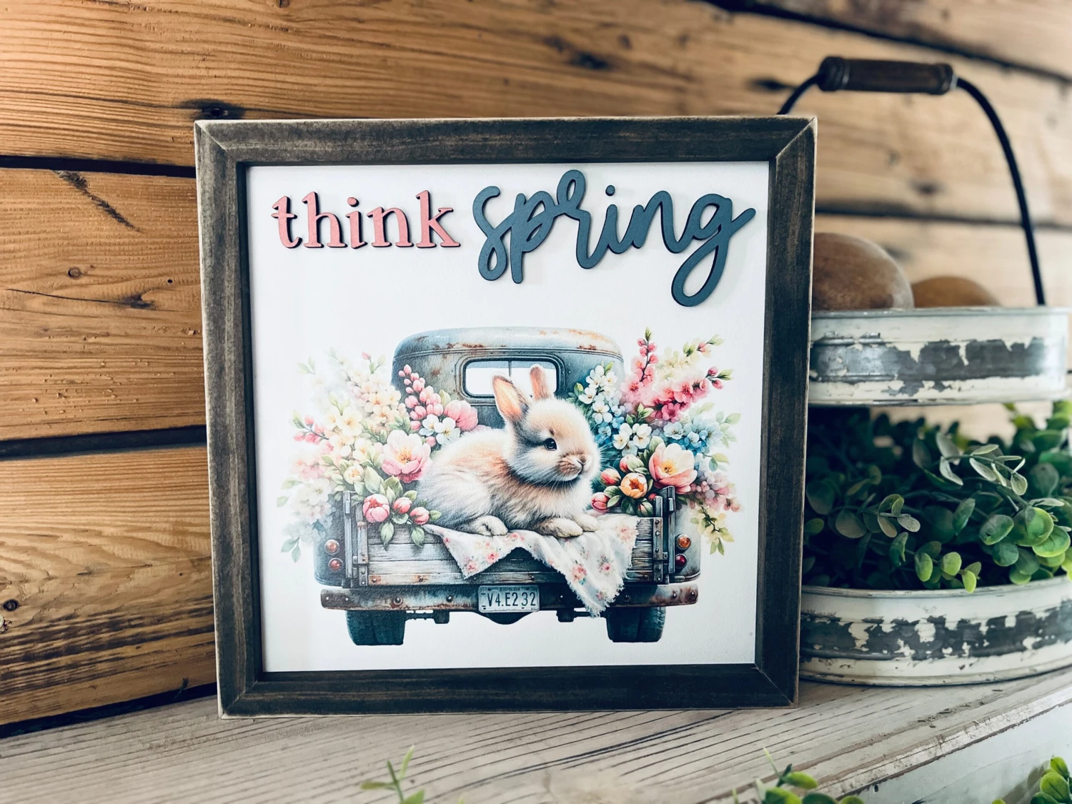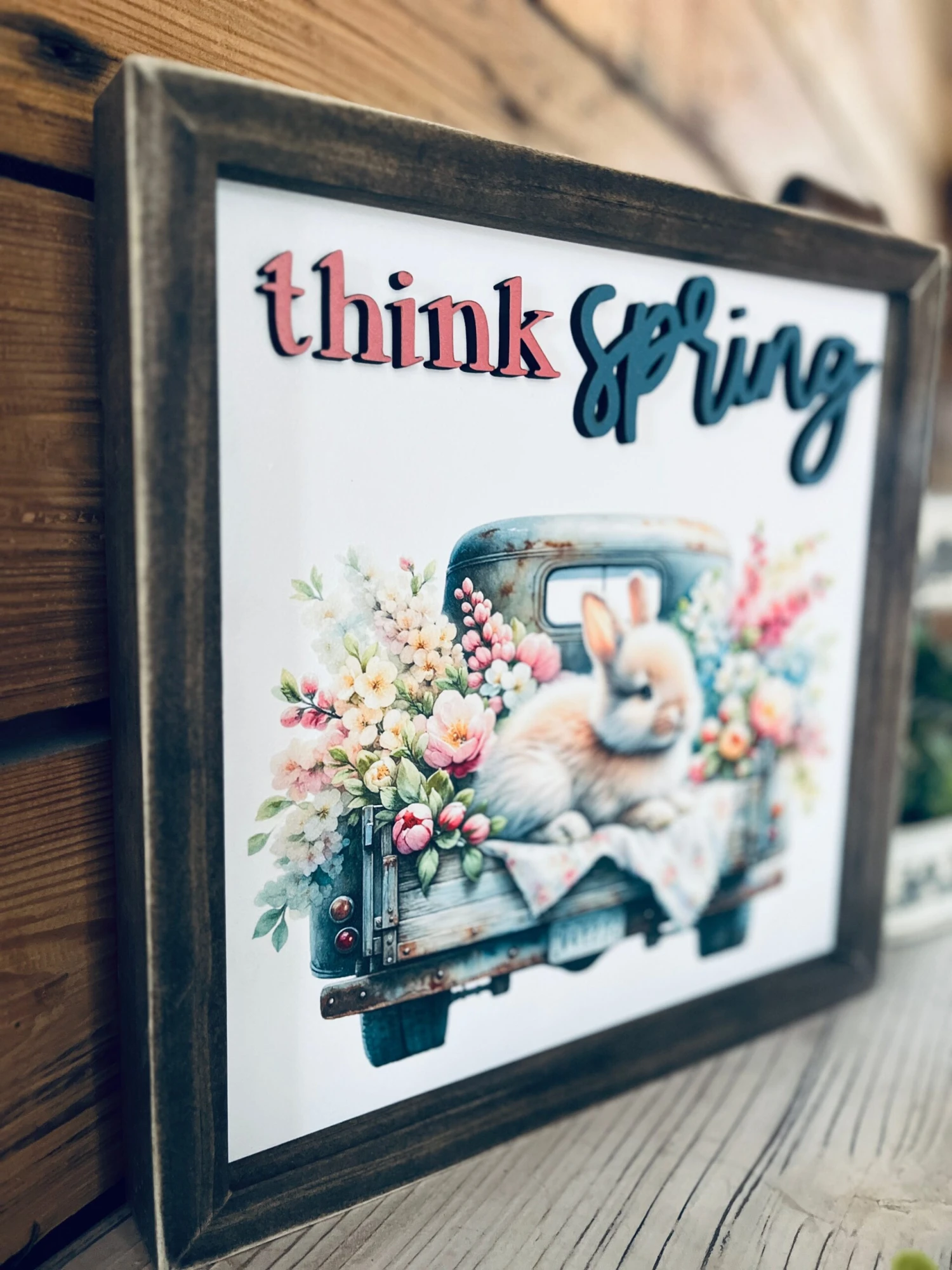 This beautifully designed “Think Spring” sign combines high-quality UV printing with laser-cut raised lettering for a stunning, dimensional look. The bunny and vintage truck are UV-printed in vibrant detail on a painted MDF backer, while the words “Think Spring” are crafted from laser-cut wood, adding texture and depth. A pine frame completes the design, giving it a warm and polished farmhouse chic touch.
