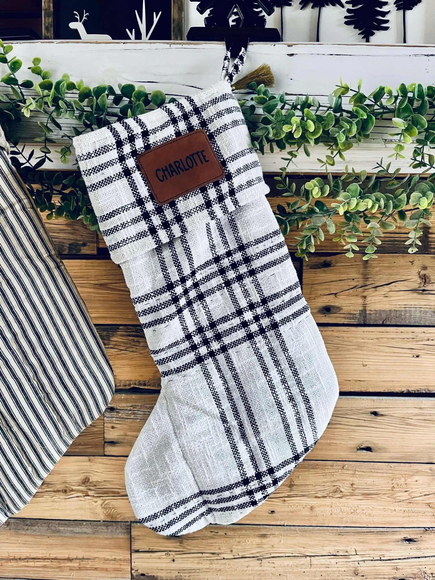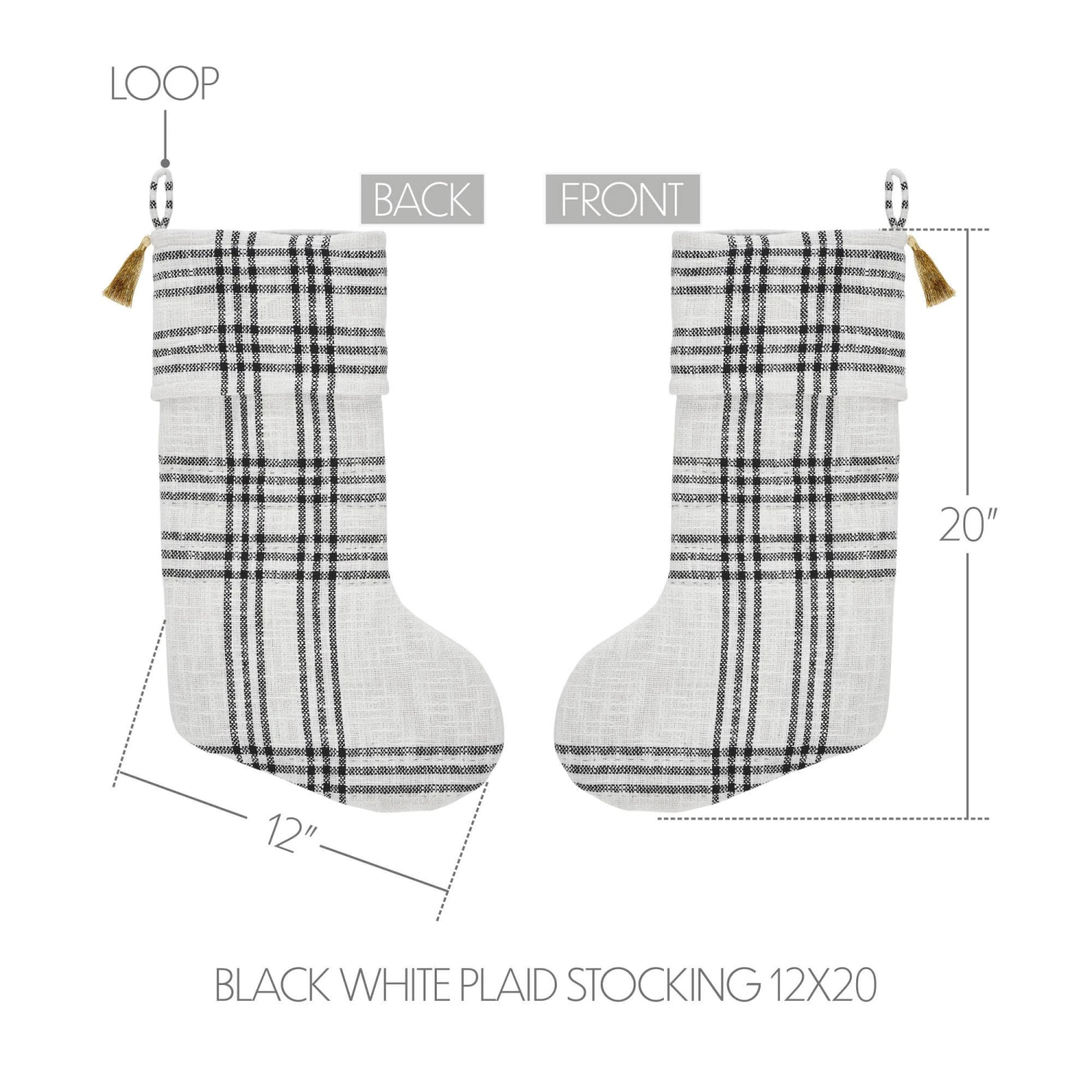 Craft the perfect elegant, minimalist Christmas look with this simple yet elegant stocking. The Wintergleam Black White Plaid Stocking features a white and black plaid base for a simple, traditional look. A coordinating cuff in matching fabric includes a gold tassel accent and a simple hanging loop. Coordinates with the Wintergleam Collection by VHC for modern farmhouse inspired style for your Christmas decor. Includes: 1 x Stocking; Care Instructions: Hand Wash, Lay Flat to Dry Material: 100% Cotton Shell, Polyester Batting, Polyester Taffeta Lining