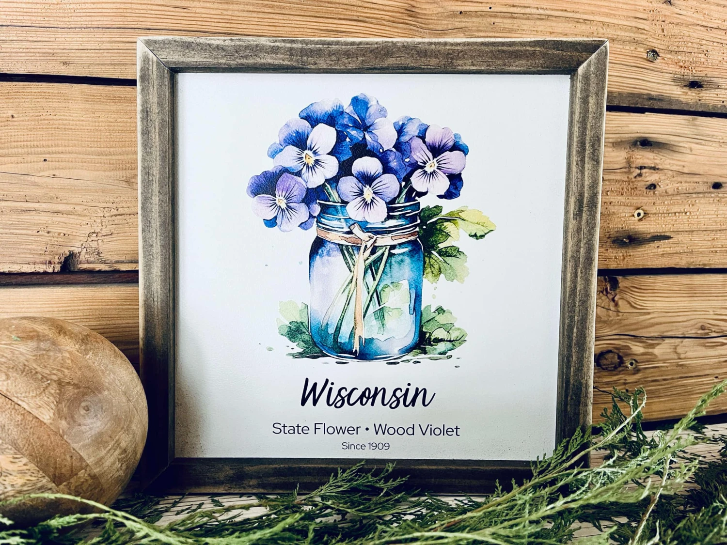 Wisconsin State Flower Wood Sign – Rustic Framed Wall Art – Wood Violet Home Decor